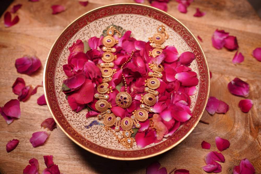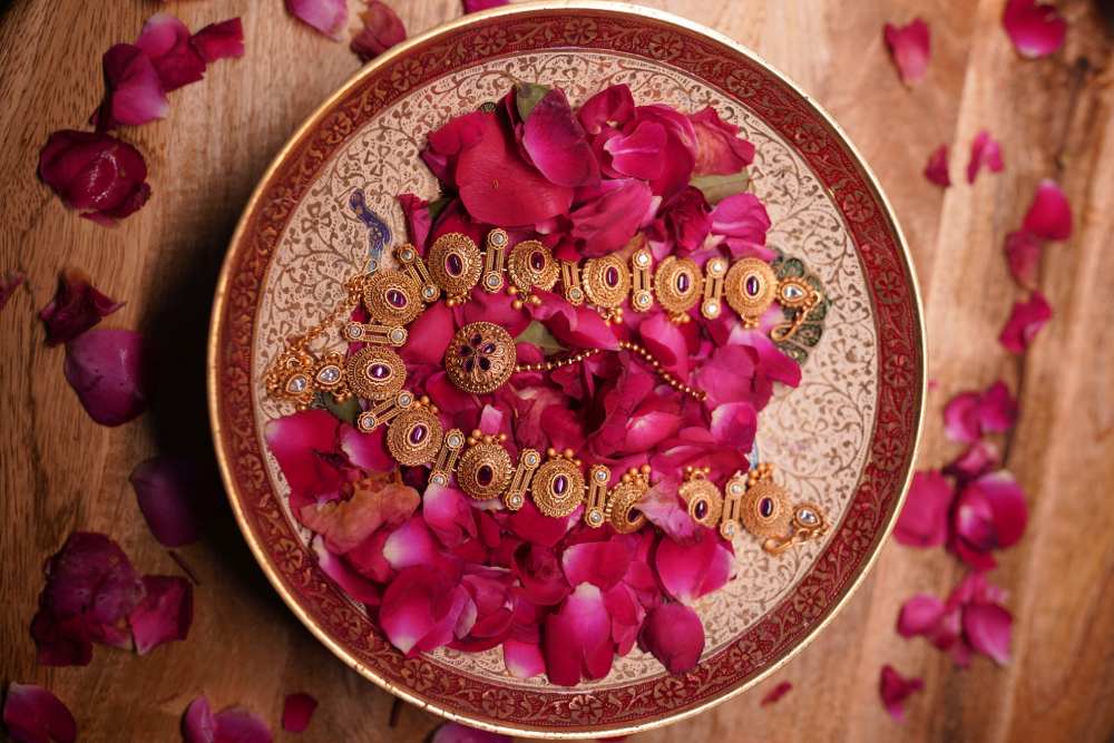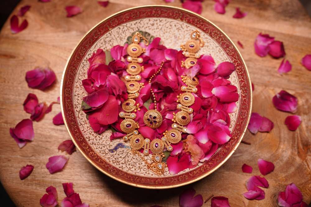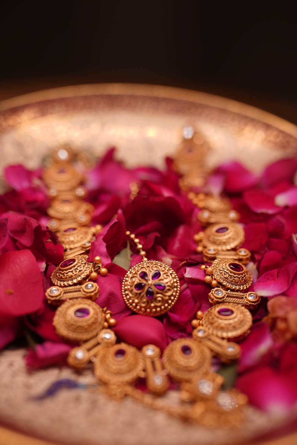 Content: Antique gold with ruby and pearl embellishments