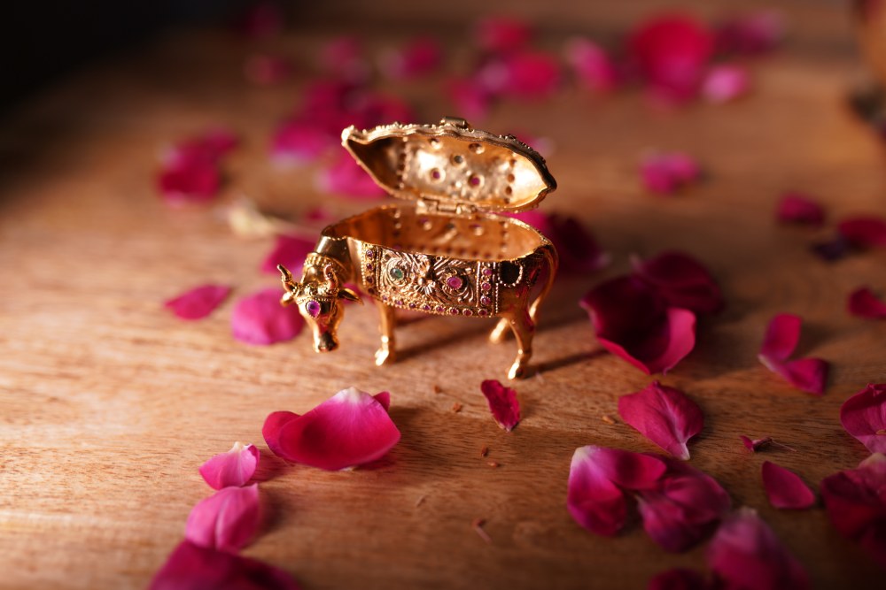 Brass kalash sindoor box with gemstone embellished sacred urn design. Perfect for traditional and festive occasions.