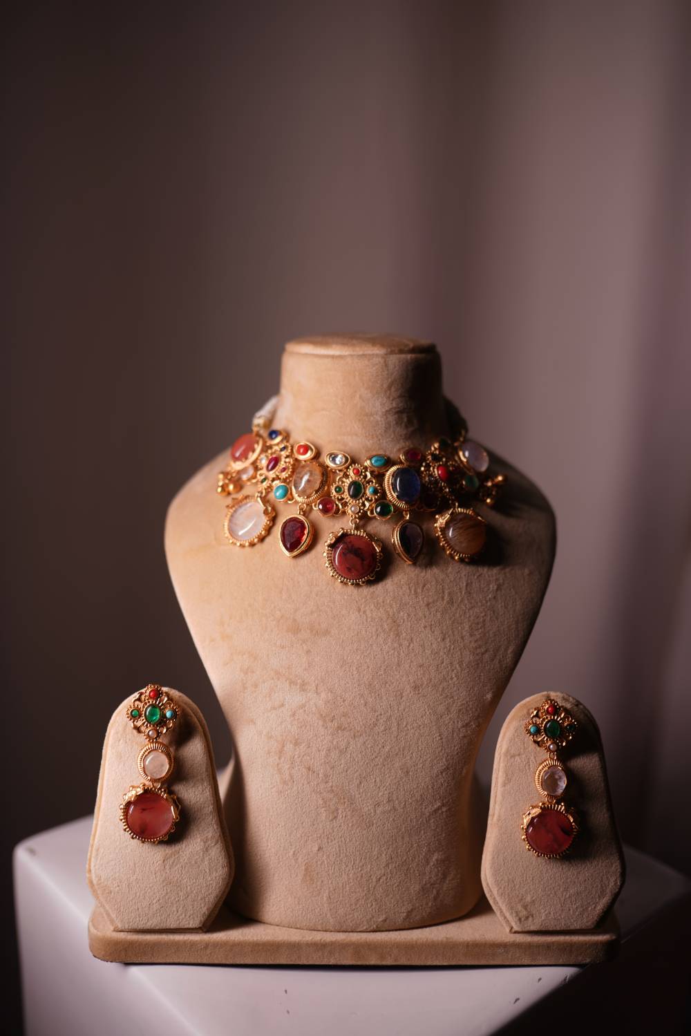 Exquisite gemstone cluster choker necklace set in antique gold, adorned with ruby, emerald, sapphire, turquoise, and lustrous pearls. Features intricate filigree work and matching drop earrings. Perfect for weddings and festive celebrations.