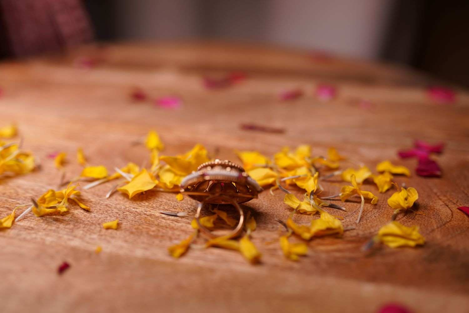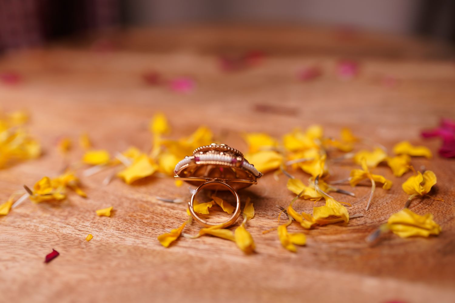 Handcrafted antique gold floral ring with ruby accents. Perfect for traditional and festive occasions.