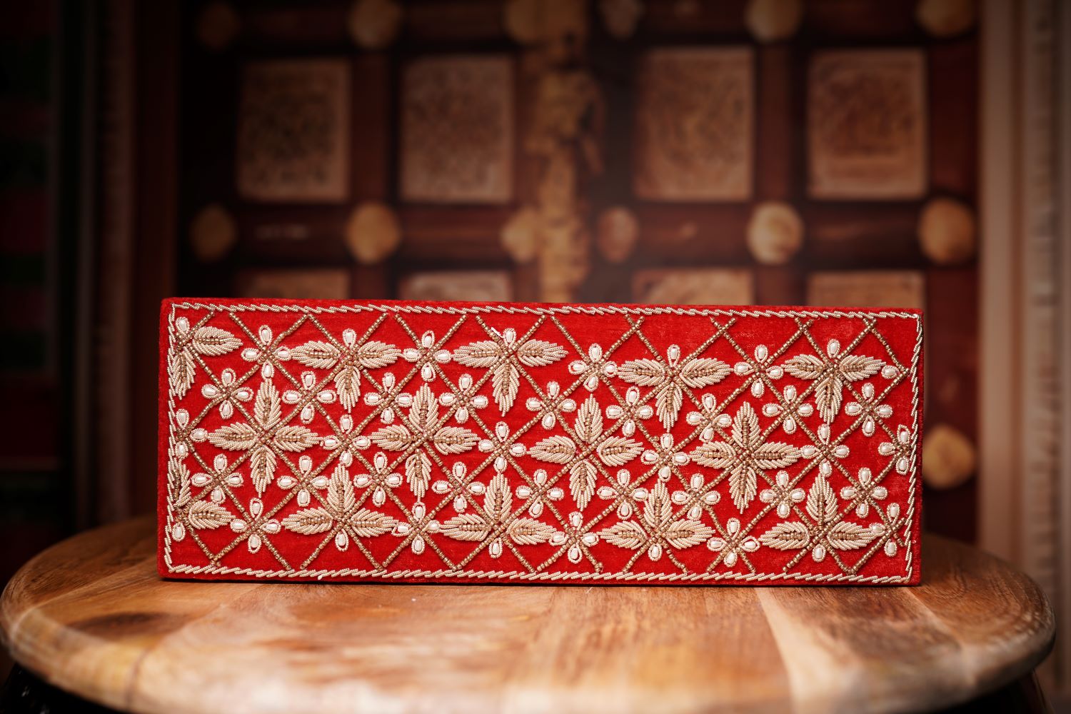 Stunning handcrafted bangle box in vibrant red with intricate gold floral embroidery. Perfect for storing your precious bangles and jewelry in style.