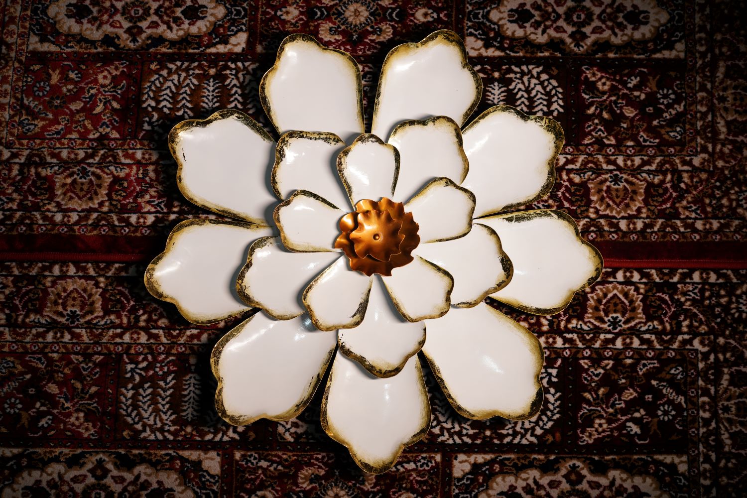 Content: Elegant white floral metal wall art adds timeless sophistication.