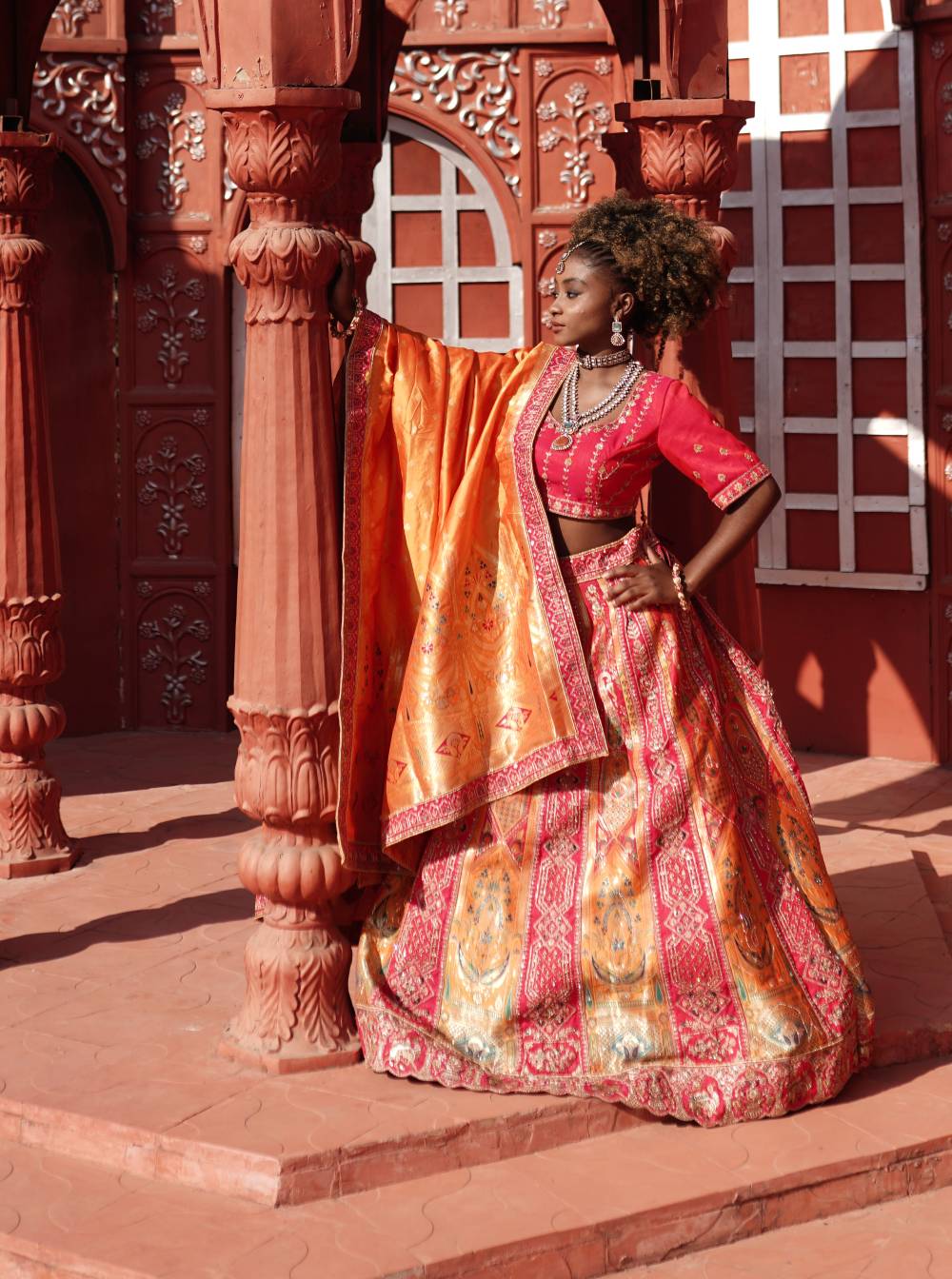 Stunning pink and orange ombre lehenga with golden embroidery. Three-piece bridal set perfect for weddings and grand celebrations.