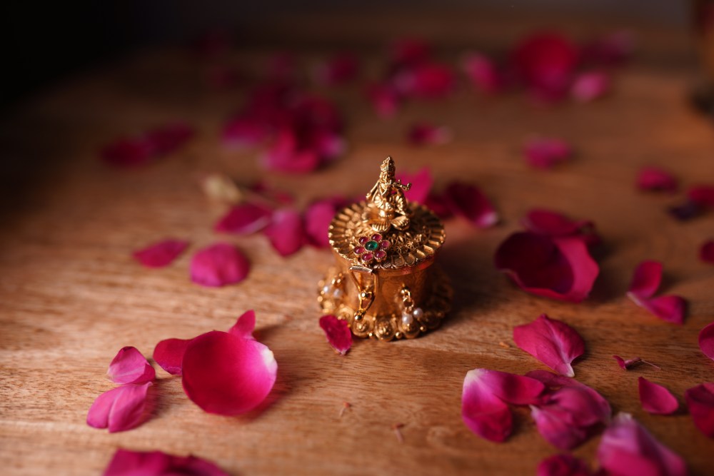 Content: Brass with antique gold finish and gemstone embellishments (ruby, emerald, pearl)