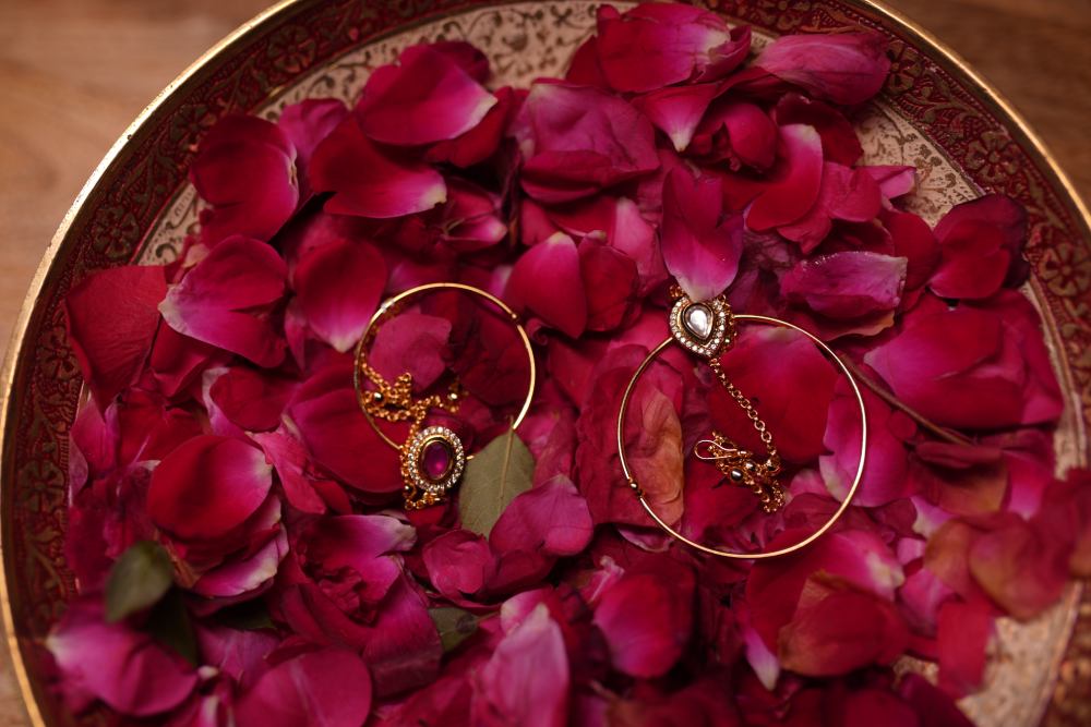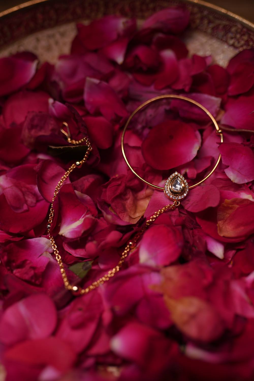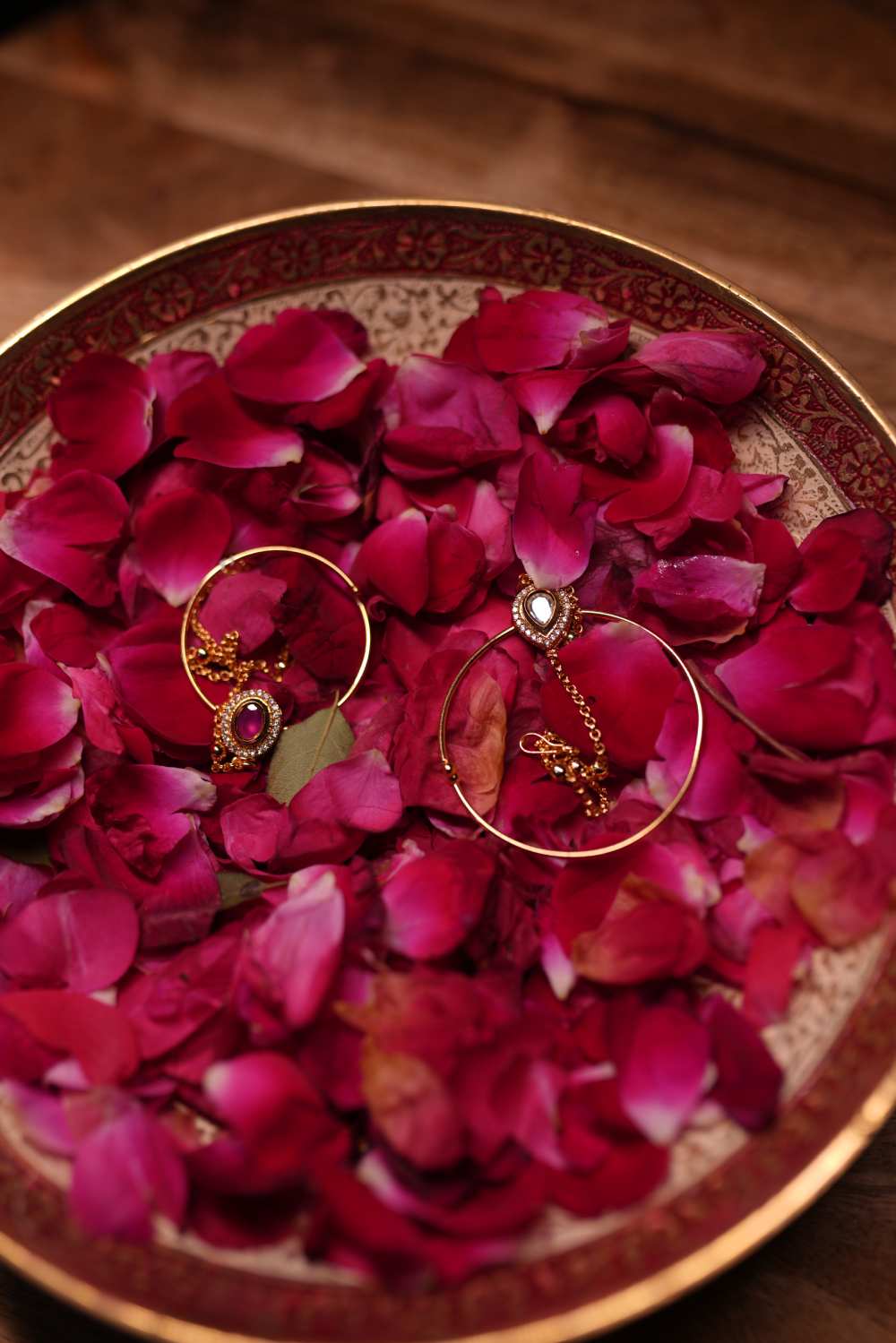 Rose gold nose ring with ruby gemstone and delicate chain. Perfect for bridal and traditional occasions