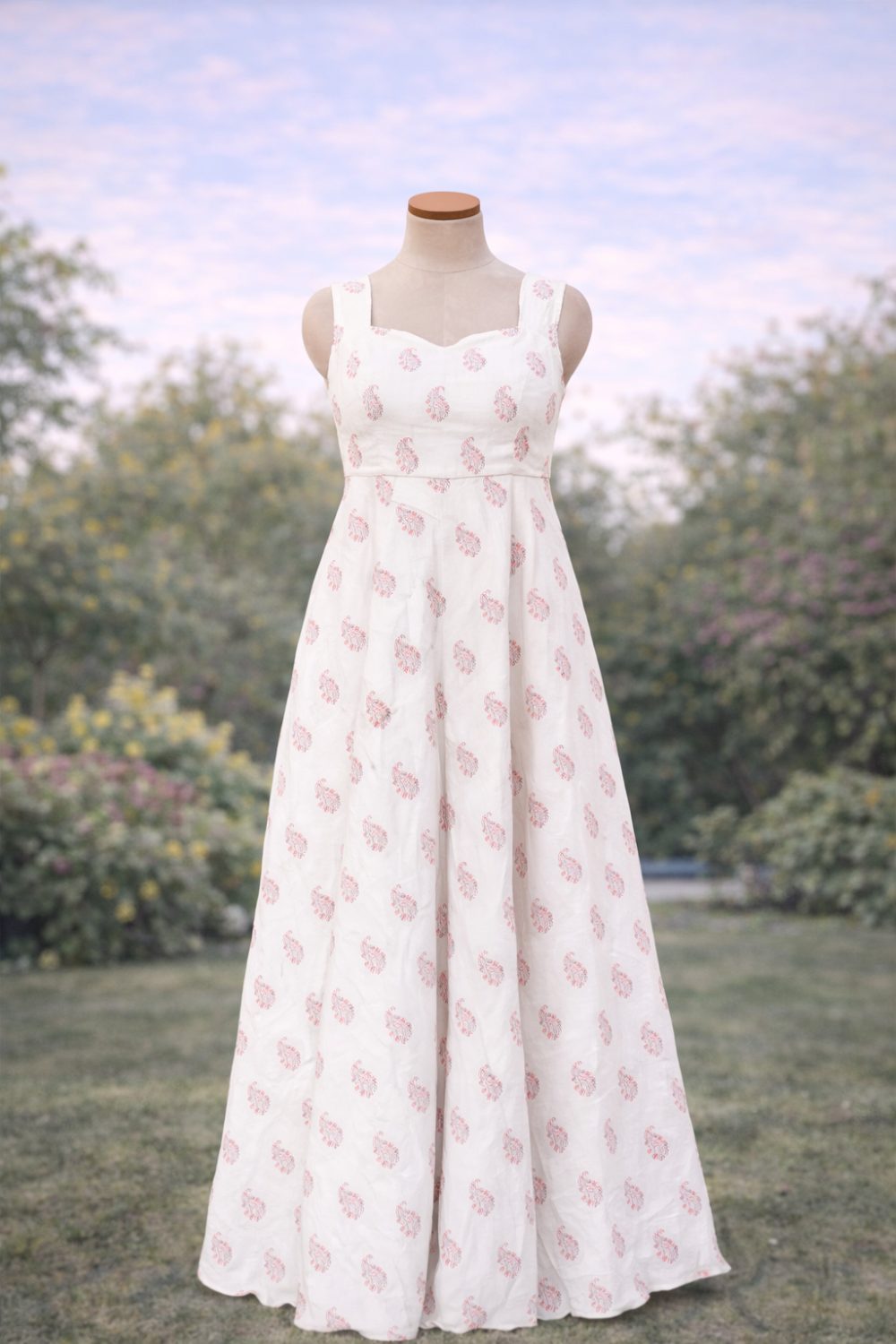 White maxi dress with delicate pink floral print. Features sweetheart neckline and wide shoulder straps. Perfect for summer events and garden parties.